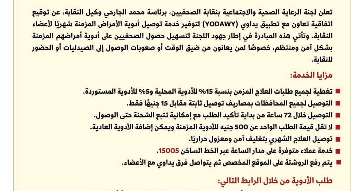 تعلن لجنة الرعاية الصحية والاجتماعية بنقابة الصحفيين، برئاسة محمد الجارحي وكيل النقابة، عن توقيع اتفاقية تعاون مع تطبيق يداوي (Yodawy) لتوفير خدمة توصيل أدوية الأمراض المزمنة شهريًا لأعضاء النقابة. وتأتي هذه المبادرة في إطار جهود اللجنة لتسهيل حصول الصحفيين على أدوية أمراضهم المزمنة بشكل آمن ومنتظم، خصوصًا لمن يعانون من ضيق الوقت أو صعوبات الوصول إلى الصيدليات أو الحضور للنقابة.