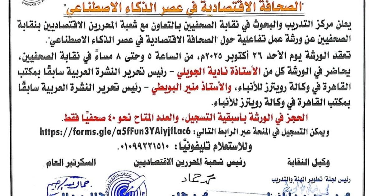 في إطار جهود نقابة الصحفيين المصرية لتعزيز قدرات الصحفيين ومواكبة التطورات الرقمية، أعلن مركز التدريب والبحوث بالنقابة بالتعاون مع شعبة المحررين الاقتصاديين عن تنظيم ورشة تدريبية تفاعلية بعنوان «الصحافة الاقتصادية في عصر الذكاء الاصطناعي»، وذلك يوم الأحد 26 أكتوبر 2025 بمقر النقابة من الساعة الخامسة حتى الثامنة مساءً.