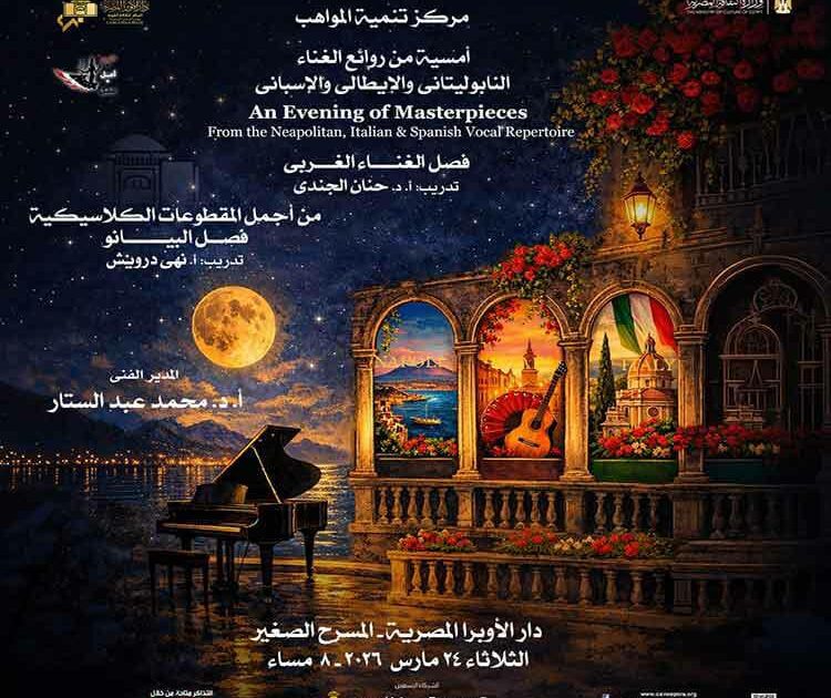 عقب إنتهاء عيد الفطر المبارك تواصل دار الأوبرا المصرية فعالياها الإبداعية حيث تقيم حفلاً للدارسين بمركز تنمية المواهب تحت إشراف مديره الفنى الدكتور محمد عبد الستار يشارك خلاله طلب فصلى الغناء الغربى تدريب الدكتورة حنان الجندى والبيانو تدريب نهى درويش وذلك فى الثامنة مساء الثلاثاء ٢٤ مارس على المسرح الصغير .