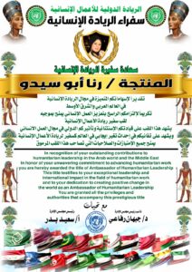 وأضافت المؤسسة الدولية فى بيان لها ” تقديرًا لاسهاماتكم المتميزة فى مجال الريادة الانسانية بالعالم العربي والشرق الأوسط، وتكريما لالتزامكم الراسخ بتعزيز العمل الانسانى تقرر منح سيادتكم لقب سفيرة للريادة الانسانية.