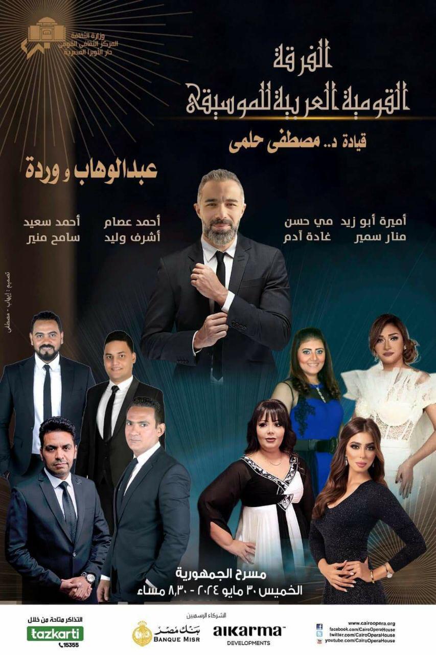 تنظم دار الأوبرا المصرية برئاسة الدكتورة لمياء زايد حفلا للفرقه القومية للموسيقي العربية بقيادة المايسترو الدكتور مصطفى حلمي وذلك في الثامنة والنصف مساء الخميس 30 مايو علي مسرح الجمهورية . يتضمن البرنامج نخبة مختارة من أشهر أعمال موسيقار الأجيال محمد عبد الوهاب والمطربة وردة منها كنت فين ، أه منك يا