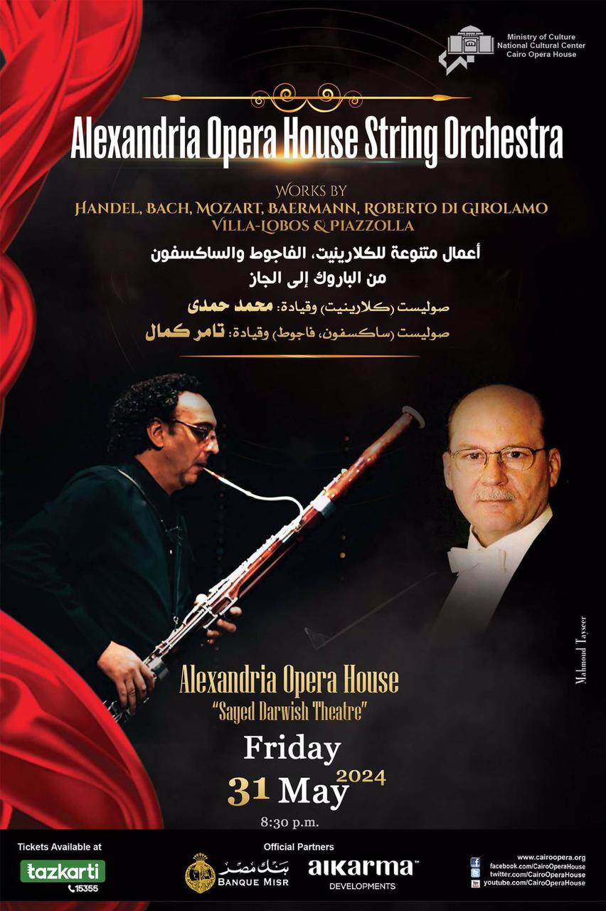 وتريات أوبرا الأسكندرية فى رحلة موسيقية من الباروك إلي الجاز تنظم دار الأوبرا برئاسة الدكتورة لمياء زايد حفلا لأوركسترا وتريات أوبرا الأسكندرية بقيادة تبادلية للعازفين المشاركين محمد حمدي " كلارينت " ، تامر كمال " ساكسفون وفاجوت " وذلك فى الثامنة والنصف مساء الجمعة 31 مايو على مسرح سيد درويش