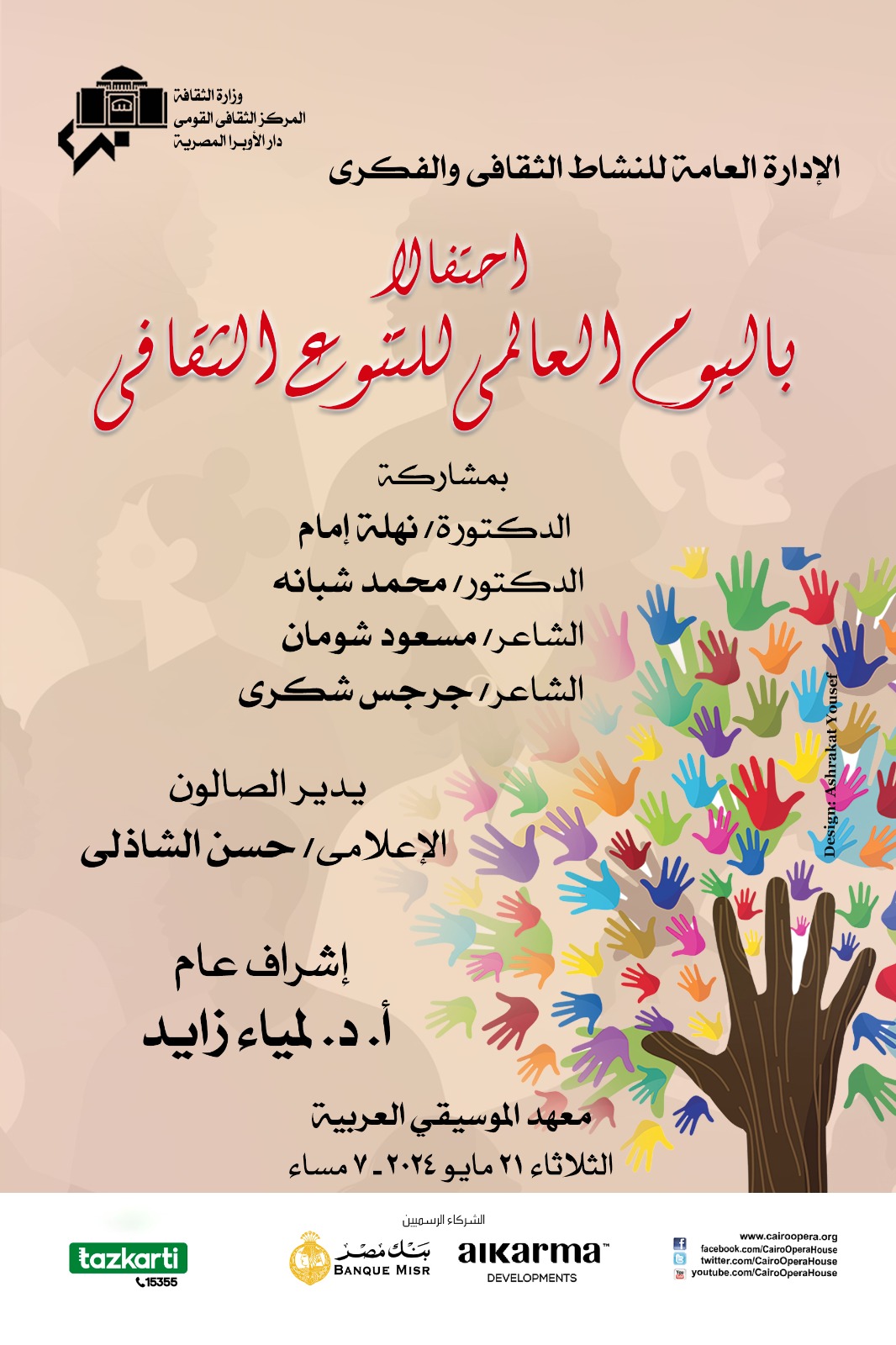 فى إطار فعاليات الثقافة المصرية تنظم دار الأوبرا برئاسة الدكتورة لمياء زايد ندوة بمناسبة اليوم العالمى للتنوع الثقافى ودوه فى التنمية بمجالاتها المختلفة بمشاركة الدكتورة نهلة امام مستشار وزير الثقافة للتراث الثقافى ، الشاعر مسعود شومان رئيس هيئه قصور الثقافة سابقا ، الدكتور محمد شبانة استاذ الموسيقى الشعبية بالمعهد العالي