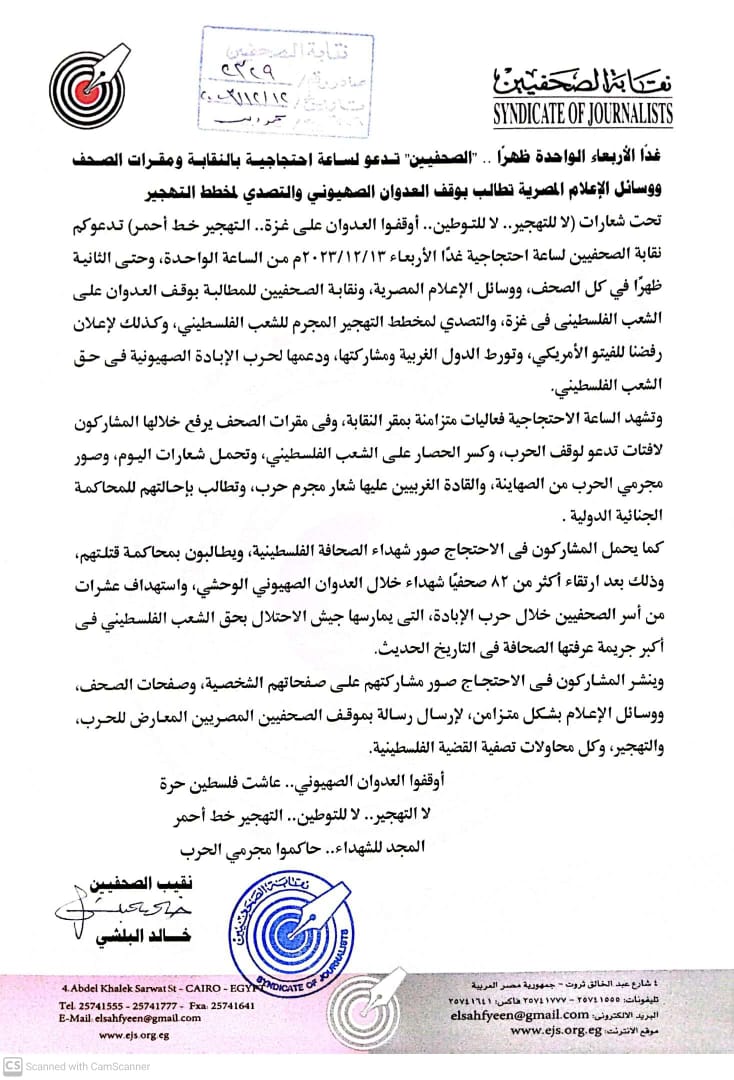 تدعوكم نقابة الصحفيين لساعة احتجاجية تحت شعارات (لا للتهجير.. لا للتوطين.. أوقفوا العدوان على غزة.. التهجير خط أحمر) وذلك يوم غدا الأربعاء القادم 2023/12/13م من الساعة الواحدة، وحتى الثانية ظهرًا في كل الصحف، ووسائل الإعلام المصرية، ونقابة الصحفيين للمطالبة بوقف العدوان على الشعب الفلسطينى فى غزة، والتصدي لمخطط التهجير المجرم