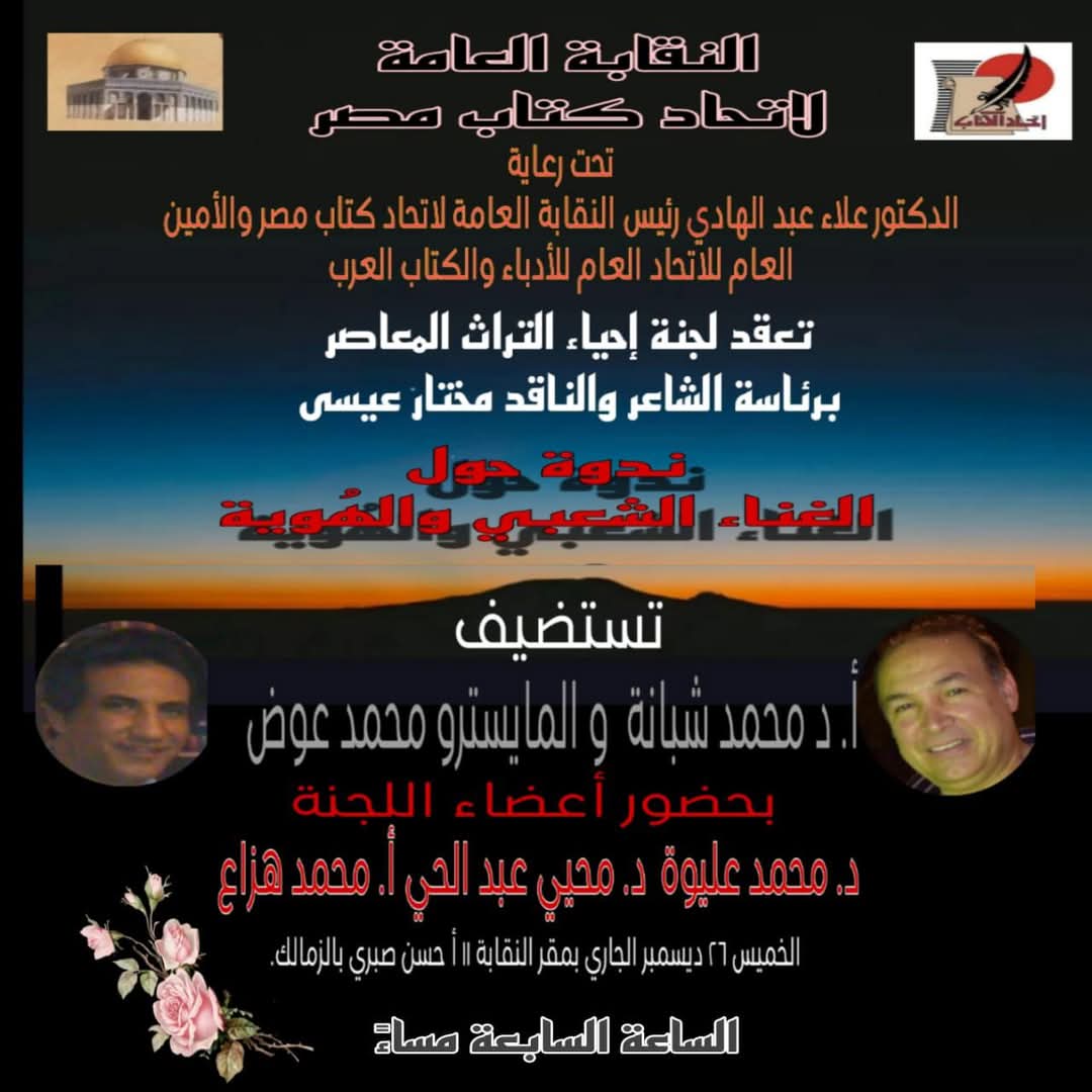 تعقد لجنة إحياء التراث الشعبي المعاصر، برئاسة الشاعر والناقد مختار عيسى، ندوة تحت عنوان الغناء الشعبي والهوية، وتستضيف د. محمد شبانة أستاذ الموسيقى الشعبية بأكاديمية الفنون، والمايسترو محمد عوض، بحضور ومشاركة أعضاء اللجنة: د. محمد عليوة، ود. محيي عبد الحي، والكاتب الصحفي محمد هزاع، وذلك يوم الخميس الموافق ٢٦ من