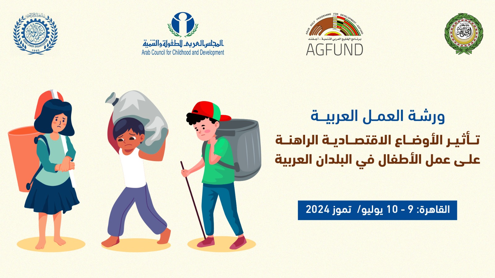أربع منظمات عربية تنظم ورشة حول عمل الأطفال بالقاهرة متابعات : منال الأخرس ينظم المجلس العربي للطفولة والتنمية برئاسة سمو الشيخ الأمير عبد العزيز بن طلال ورشة متخصصة حول عمالة الأطفال بمشاركة دولية واسعة النطاق حيثت عقد ورشة العمل العربية بعنوان "تأثير الأوضاع الاقتصادية الراهنة على عمل الأطفال في