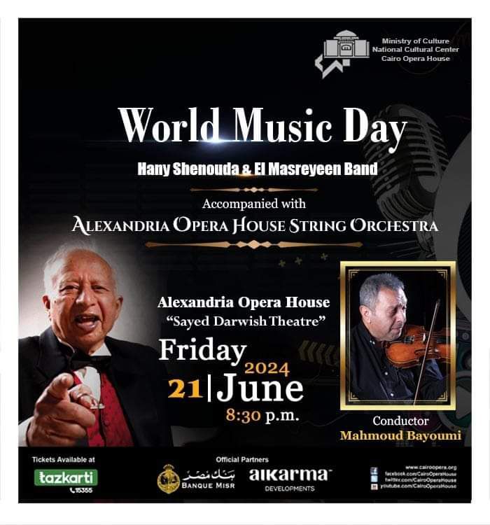 متابعة القراءةإحتفالا بعيد الموسيقى العالمى * هانى شنودة وفرقة المصريين بمصاحبة اوركسترا وتريات اوبرا الاسكندرية تنظم دار الأوبرا برئاسة الدكتورة لمياء زايد حفلا لأوركسترا وتريات أوبرا الأسكندرية بقيادة المايسترو محمود بيومى ضمن خطط الثقافة المصرية للإحتفال بعيد الموسيقى العالمىوبمشاركة الموسيقار الكبير هانى شنودة وفرقة المصريين وذلك فى الثامنة والنصف مساء الجمعة