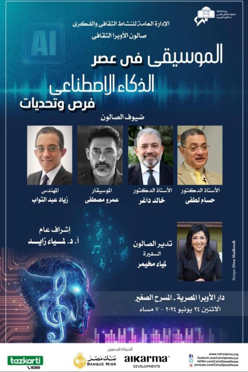 الإثنين القادم الموسيقى فى عصر الذكاء الإصطناعى بصالون الأوبرا الثقافى تنظم دار الأوبرا برئاسة الدكتورة لمياء زايد فى إطار فعاليات الثقافة المصرية التنويرية لمواكبة التطور وتطويع أدواته للإرتقاء بالموسيقى والفنون نشاطها الثقافى والفكرى فى السابعة مساء الإثنين ٢٤ يونيو على المسرح الصغير صالون الأوبرا الثقافى بعنوان " الموسيقى فى عصر