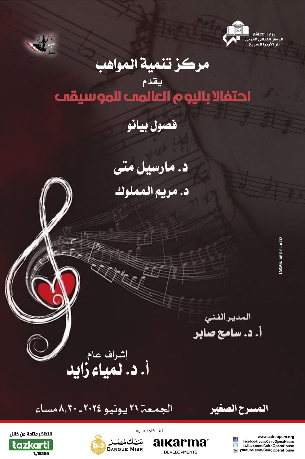 مواهب الأوبرا تحتفل باليوم العالمى للموسيقى بالمسرح الصغير تنظم دار الأوبرا برئاسة الدكتورة لمياء زايد حفلا لمركز تنمية المواهب تحت إشراف المدير الفنى الدكتور سامح صابر فى الثامنة والنصف مساء الجمعة ٢١ يونيو على المسرح الصغير. فى إطار احتفالات الثقافة المصرية باليوم العالمى للموسيقى يحى الحفل فصول البيانو إشراف وتدريب