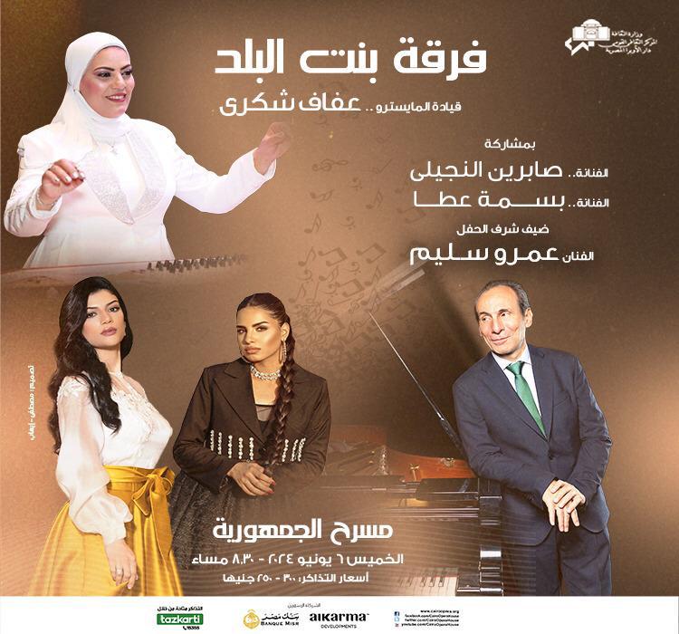 متابعة القراءةتنظم دار الأوبرا برئاسة الدكتورة لمياء زايد حفلا لفرقة بنت البلد بقيادة المايسترو عفاف شكري ومشاركة الفناناتان صابرين النجيلى وبسمة عطا مع ضيف الشرف عازف البيانو الشهير والموزع الموسيقى عمرو سليم وذلك في الثامنة والنصف مساء الخميس 6 يونيو على مسرح الجمهورية . يتضمن البرنامج عدد من أعمال الموسيقى