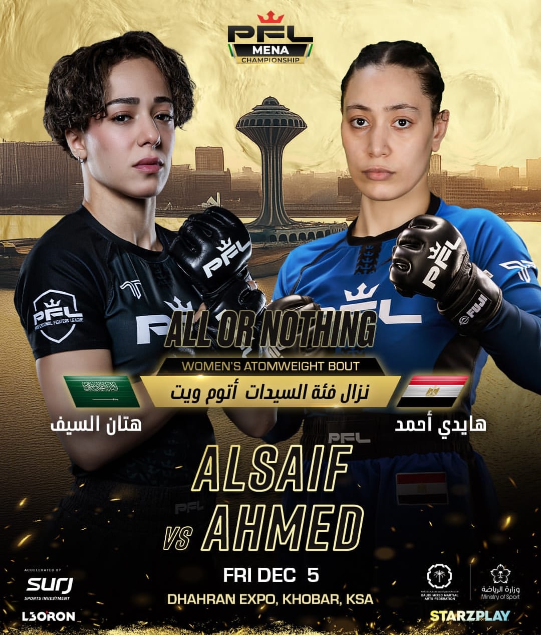 الرياض -  تستعد البطلة السعودية هتان السيف لخوض أول نزال احترافي لها ضمن نهائيات دوري المقاتلين المحترفين لمنطقة الشرق الأوسط وشمال إفريقيا، والمقرر إقامته يوم 5 ديسمبر المقبل في مدينة الخبر.  وتواجه السيف في هذا النزال المرتقب المقاتلة المصرية هايدي أحمد، في مواجهة تحمل طابعاً خاصاً كونها أول