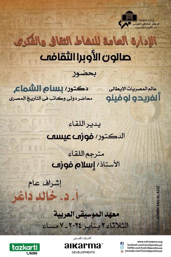 متابعة القراءةتعقد دار الاوبرا المصرية برئاسة الدكتور خالد داغر لقاء ثقافى بمشاركة العالم الايطالى ألفريدو لوفينو ، الدكتور بسام الشماع المؤرخ والمحاضر الدولى والمرشد السياحى ويديره الدكتور فوزى عيسى أستاذ مساعد متفرغ بقسم اللغة الإيطالية بكلية الألسن، جامعة عين شمس ويقوم بالترجمة إسلام فوزى وذلك فى السابعة مساء الثلاثاء 2 يناير