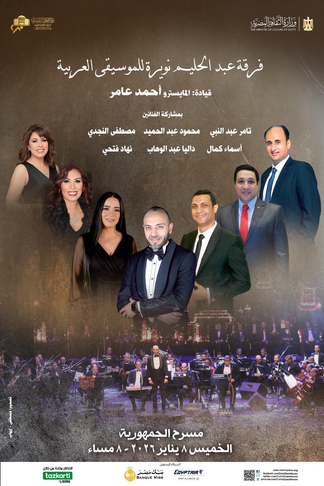 متابعة القراءةتقيم دار الأوبرا المصرية برئاسة الدكتور علاء عبد السلام حفلاً لفرقة عبد الحليم نويرة للموسيقى العربية بقيادة المايسترو أحمد عامر وذلك فى الثامنة مساء الخميس 8 يناير على مسرح الجمهورية . يتضمن البرنامج نخبة من المنوعات الغنائية لزمن الفن الجميل منها فى يوم وليلة، كامل الأوصاف، الدنيا ريشة فى هوا،