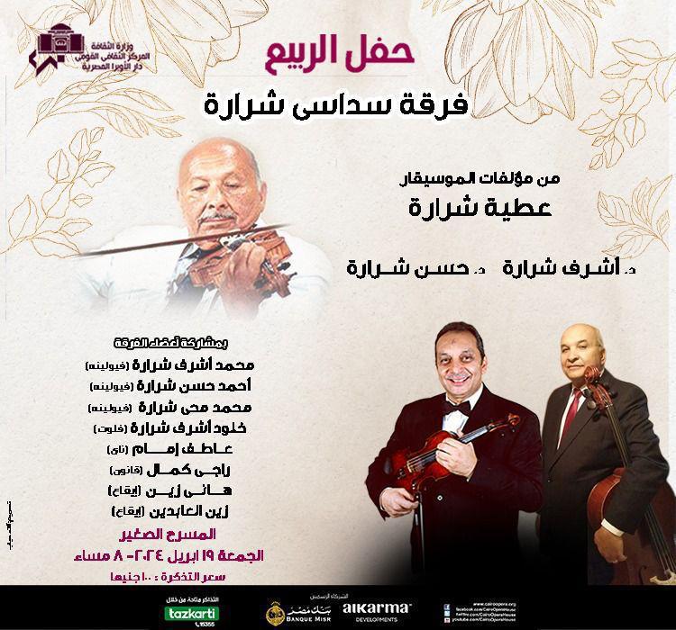 متابعة القراءةسداسى شرارة يحتفل بالربيع فى الأوبرا تنظم دار الأوبرا المصرية برئاسة الدكتورة لمياء زايد حفلا لفرقة سداسي شرارة بمناسبة أعياد الربيع وذلك في الثامنة مساء الجمعة 19 ابريل على المسرح الصغير بمشاركة العازفين الدكتور حسن شرارة - محمد اشرف شرارة - احمد حسن شرارة - محمد محي شرارة ( فيولينه