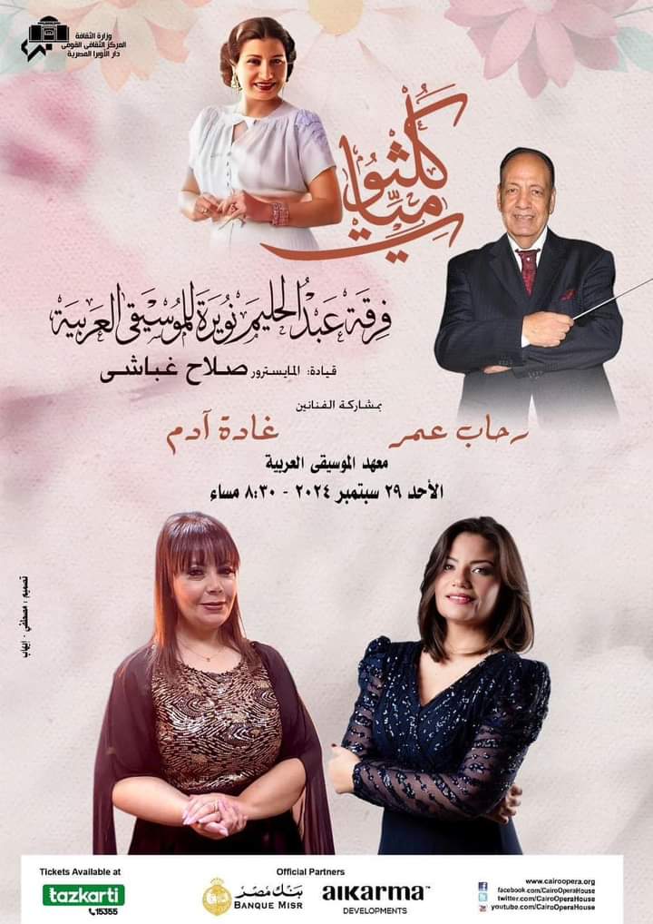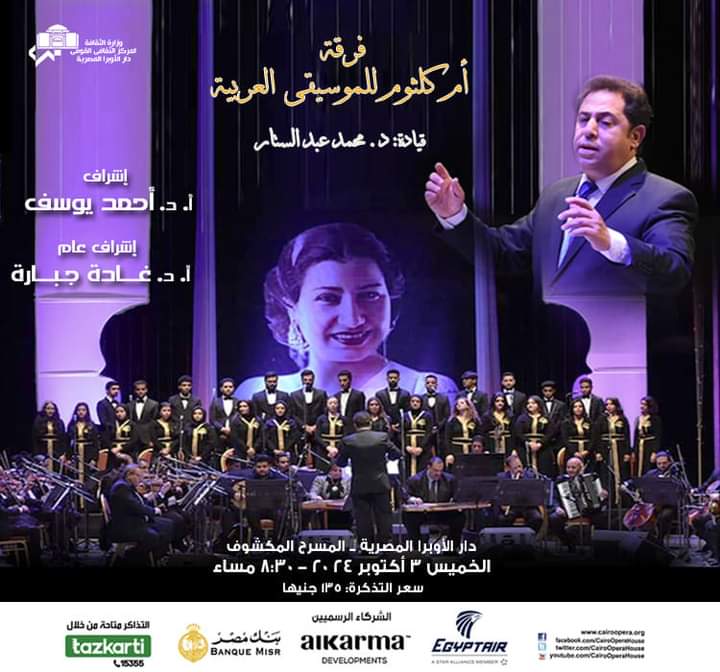 تقيم دار الأوبرا المصرية سهرة فنية ودعت الجمهور عبر صفحتها على موقع التواصل الاجتماعي فيسبوك بأسلوب عصري رشيق يحفز عشاق الفن الراقي على الحضور وكان تلك الكلمات : انضموا إلينا في ليلة ساحرة مليئة بالألحان العذبة والأغاني الرائعة مع فرقة أم كلثوم للموسيقى العربية. يوم الخميس ٣ أكتوبر ٢٠٢٤ -