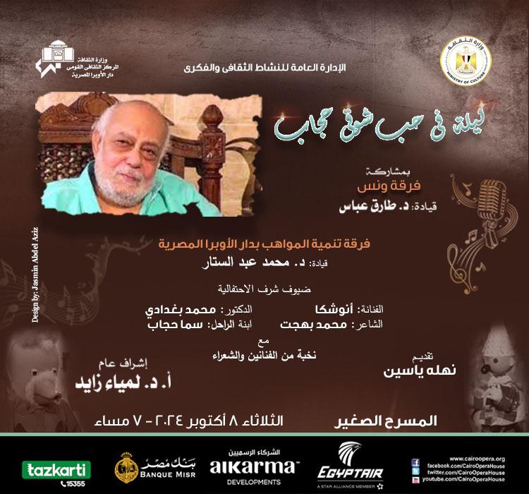 وزارة الثقافة المصرية تحتفى بالشاعر شوقي حجاب فى المسرح الصغير بالأوبرا تقيم دار الأوبرا المصرية برئاسة الدكتورة لمياء زايد فى إطار نشاطها الثقافى والفكري ضمن فعاليات وزارة الثقافة المصرية المميزة احتفاءً بالمبدعين ليلة فى حب الشاعر الكبير الراحل شوقى حجاب وذلك في السابعة مساء الثلاثاء ٨ أكتوبر علي