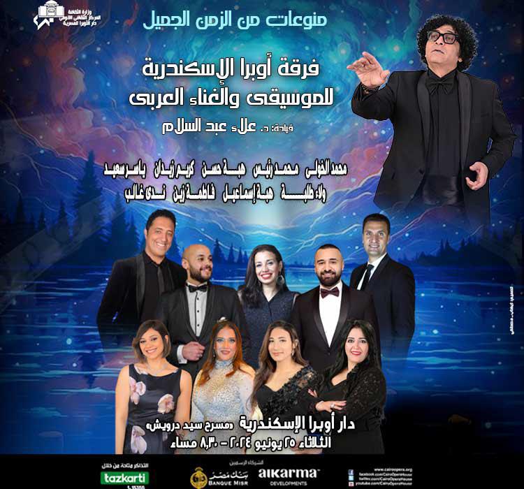 أروع أعمال رموز الموسيقى والغناء العربى على مسرح سيد درويش تنظم دار الأوبرا المصرية برئاسة الدكتورة لمياء زايد حفلا  ضمن فعاليات الثقافة المصرية لتقديم أروع أعمال رموز الموسيقى و الغناء  العربى بعنوان منوعات من الزمن الجميل لفرقة أوبرا الإسكندرية للموسيقى والغناء العربى بقيادة المايسترو الدكتور علاء عبد السلام في الثامنة