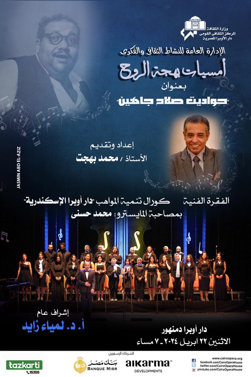 متابعة القراءةتعقد دار الاوبرا المصرية برئاسة الدكتورة لمياء زايد ضمن نشاطها الثقافى والفكرى امسية بعنوان "حواديت صلاح جاهين" اعداد وتقديم محمد بهجت تاتى ضمن سلسلة أمسيات بهجة الروح ويتخللها فقرة فنية لكورال مركز تنمية المواهب بأوبرا الإسكندرية بقيادة المايسترو الدكتور محمد حسنى وذلك فى السابعة مساء الاثنين 22 ابريل بمسرح أوبرا