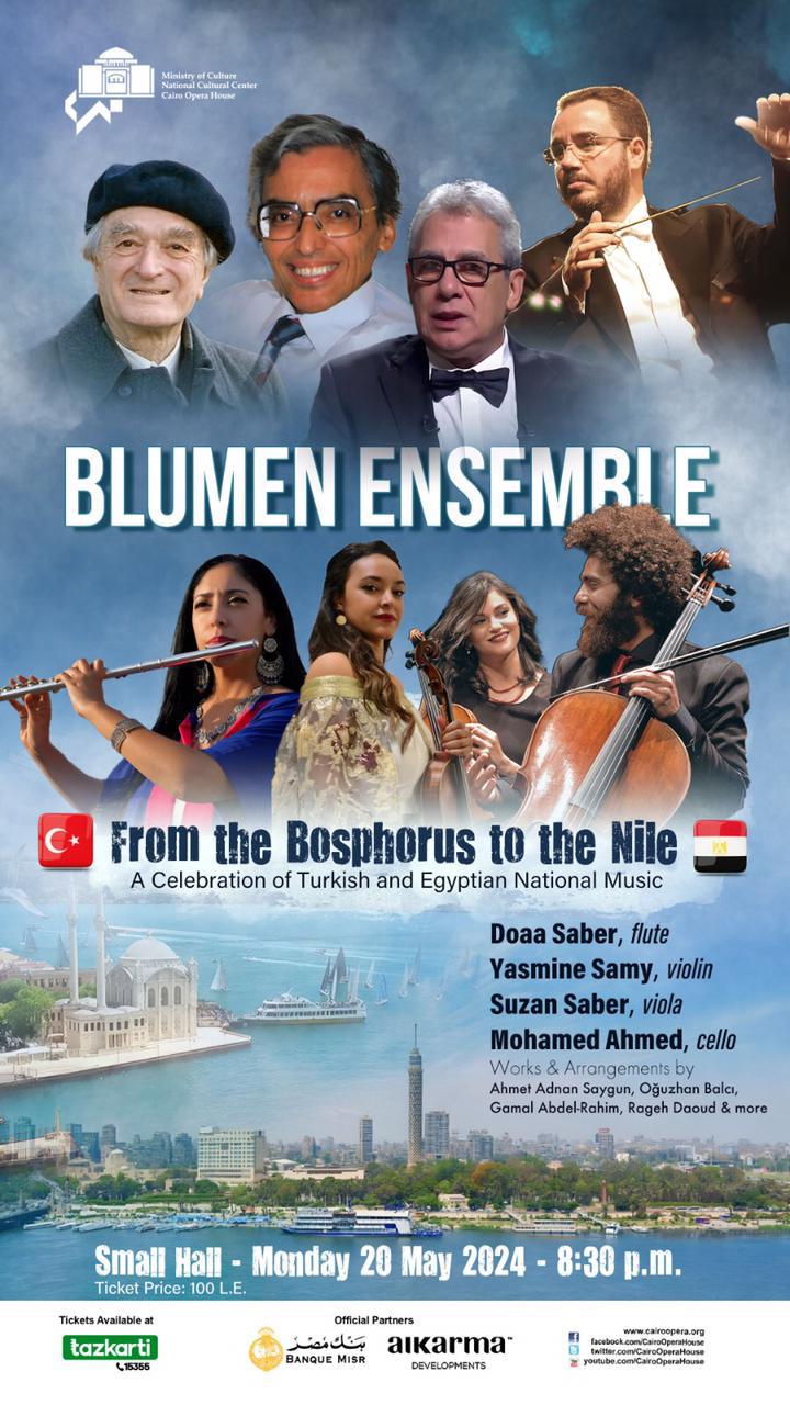 متابعة القراءةتنظم دار الأوبرا برئاسة الدكتورة لمياء زايد حفلا بعنوان من البوسفور إلى النيل بمشاركة العازفين دعاء صابر ( فلوت ) ، ياسمين سامى إبراهيم - أدهم صبرى ( فيولينة ) ، سوزان صابر ( فيولا ) ، محمد أحمد ( تشيللو ) ، عمرو سيف ( كونتر باص ) ، رضوى