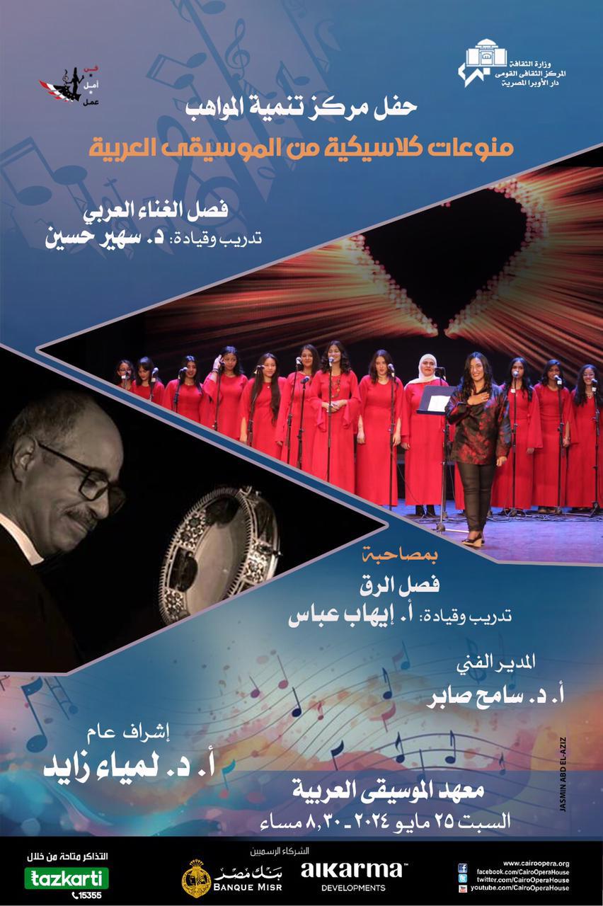 أعمال طربية تراثية لمواهب الأوبرا بمعهد الموسيقى استمرار لجهود الثقافة المصرية الداعمة للمواهب الفنية الواعدة تنظم دار الأوبرا برئاسة الدكتورة لمياء زايد حفل بعنوان "منوعات كلاسيكية من الموسيقى العربية" لطلاب مركز تنمية المواهب تحت إشراف المدير الفنى للمركز الدكتور سامح صابر فصل الغناء العربى تدريب وقيادة الدكتورة سهير حسين بمصاحبة