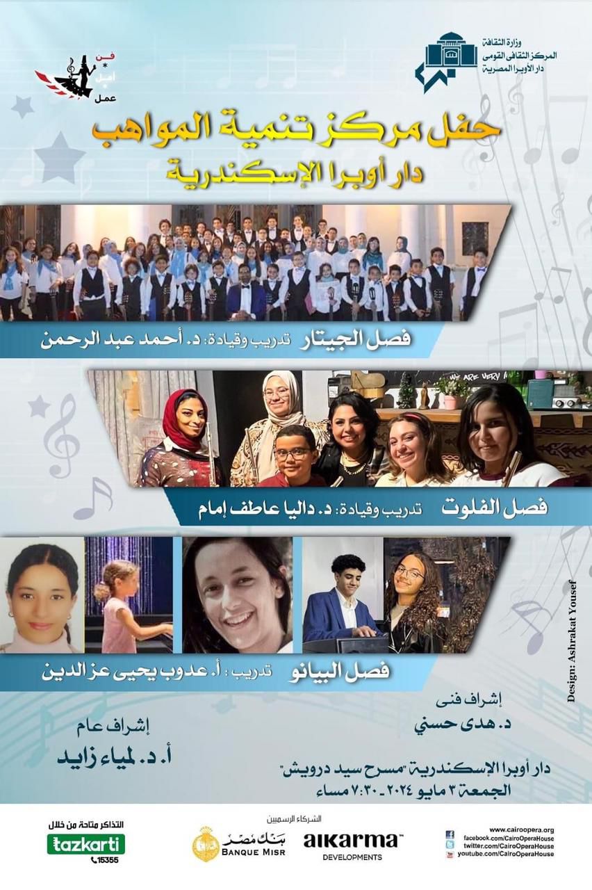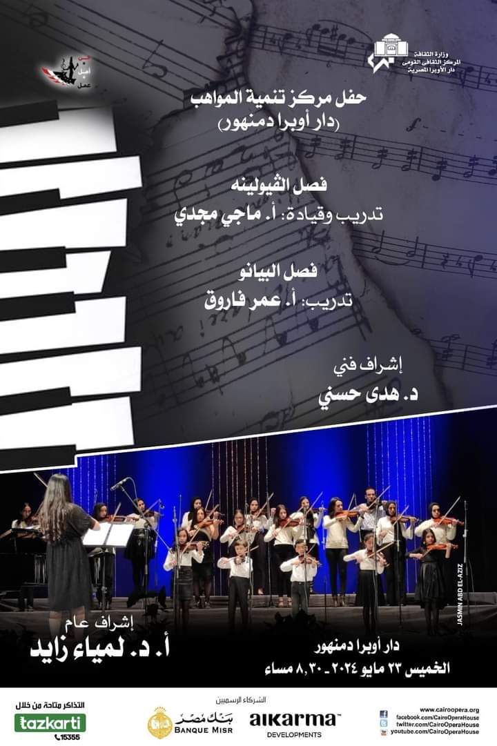 تقيم دار الأوبرا برئاسة الدكتورة لمياء زايد حفلا للدارسين بمركز تنمية المواهب بأوبرا دمنهور تحت إشراف الدكتورة هدى حسنى فصل الفيولينة تدريب وقيادة ماجى مجدى ويصاحبه عازف البيانو أمير عوض وفصل البيانو تدريب عمر فاروق وذلك فى الثامنة والنصف مساء الخميس 23 مايو على مسرح أوبرا دمنهور . ضمن توجهات