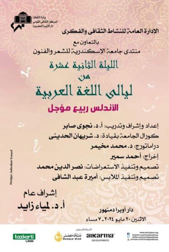 تواصل دار الأوبرا المصرية برئاسة الدكتورة لمياء زايد بالتعاون مع منتدى كلية الاداب للشعر والفنون بجامعة الاسكندرية تنظيم فعاليات ليالى اللغة العربية التى تأتي ضمن نشاطها الثقافى والفكرى حيث تقام الليلة الثانية عشر تحت عنوان الأندلس ربيع مؤجل وذلك فى السابعة مساء الاثنين 20 مايو على مسرح أوبرا دمنهور .
