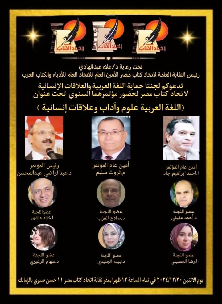 متابعة القراءةتقيم لجنتا العلاقات الإنسانية برئاسة الشاعر المهندس ثروت سليم و حماية اللغة العربية برئاسة الشاعر الأستاذ أحمد جاد مؤتمرهما السنوي ( لليوم الواحد) صباح غدا الاثنين الموافق 30 / 12/ 2024 تحت عنوان اللغة العربية علومٌ وآدابٌ وعلاقاتٌ إنسانية حيث يتضمن برنامج المؤتمر العديد من المحاور يناقشها كوكبة من علماء اللغة