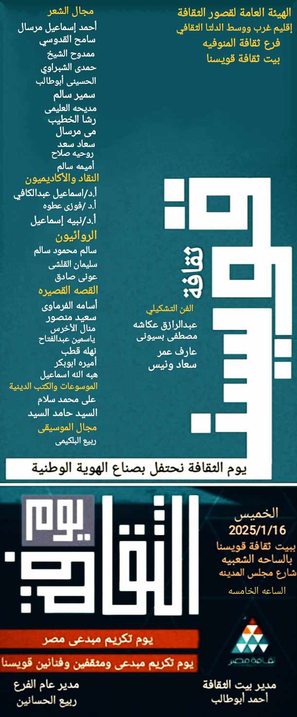 متابعة القراءةيستعد بيت ثقافة قويسنا لإقامة احتفالية كبرى لتكريم نخبة من الأدباء والكتاب في مختلف المجالات الثقافية في يوم الثقافة و ذلك يوم الخميس الموافق 16/1وذلك بقاعة الاحتفالات ببيت ثقافة قويسنا حيث يتم تكريم نخبة من الأدباء والمثقفين والكتاب والفنانين التشكيليين وعلى رأسهم الكاتب الكبير سالم محمود سالم و الشاعر الكبير