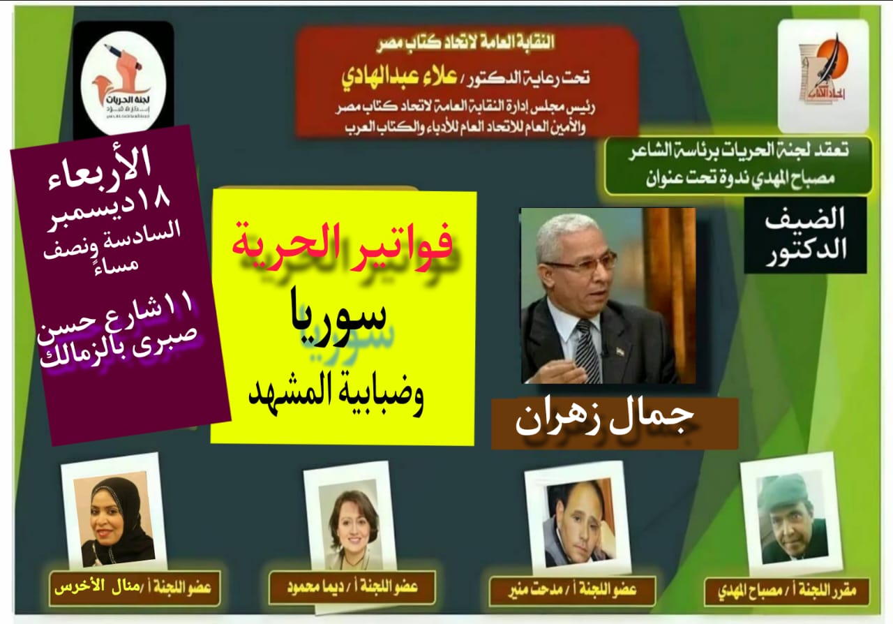 كتبت / منال الأخرس تقيم لجنة الحريات بالنقابة العامة لاتحاد كتاب مصر برئاسة الشاعر مصباح المهدي ندوة بعنوان فواتير الحرية سوريا وضبابية المشهد تستضيف فيها الدكتور جمال زهران كما يحضر عدد من النخب ورؤساء الأحزاب استجابة لحديث الساعة هروب بشار الأسد طاويا صفحة حكم طائفي استمر 55 عاما عانى