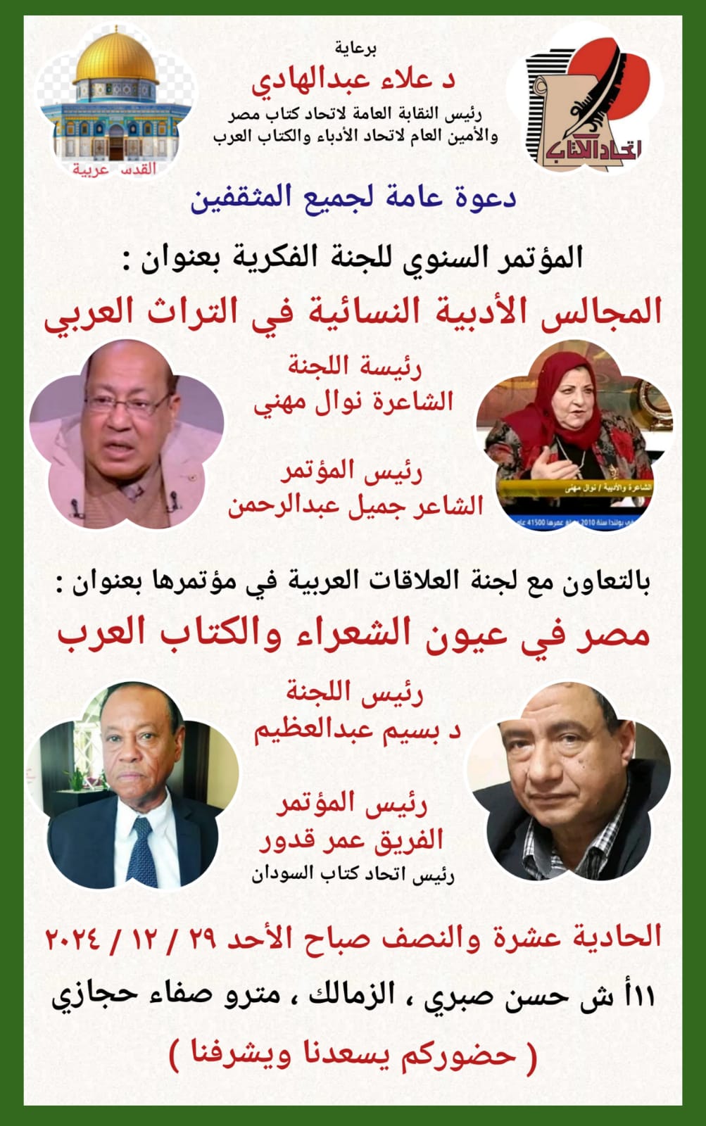 تعقد لجنة العلاقات العربية برئاسة الشاعر والناقد د. بسيم عبد العظيم مؤتمرها السنوي الثاني ظهر الأحد ٢٩ من ديسمبر ٢٠٢٤م تحت عنوان: مصر في عيون الكتاب والشعراء العرب. وذلك بالاشتراك مع اللجنة الفكرية برئاسة الأديبة أ. نوال مهنى وعنوان مؤتمرها: المجالس الأدبية النسائية في التراث العربي. وذلك تحت رعاية