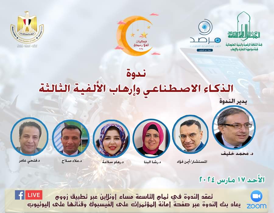 متابعة القراءةدعى الدكتور هشام عزمي - الأمين العام للمجلس الأعلى للثقافة؛ والدكتور محمد خليف - مقرر لجنة الثقافة الرقمية والبنية المعلوماتية الثقافية.، الدكتور أحمد زايد " مقرر لجنة مواجهة التطرف والإرهاب لحضور كل من يهمه الأمر لحضور ومتابعة مائدة مستديرة بعنوان " الذكاء الاصطناعي وإرهاب الألفية الثالثة " التي تنظمها لجنة