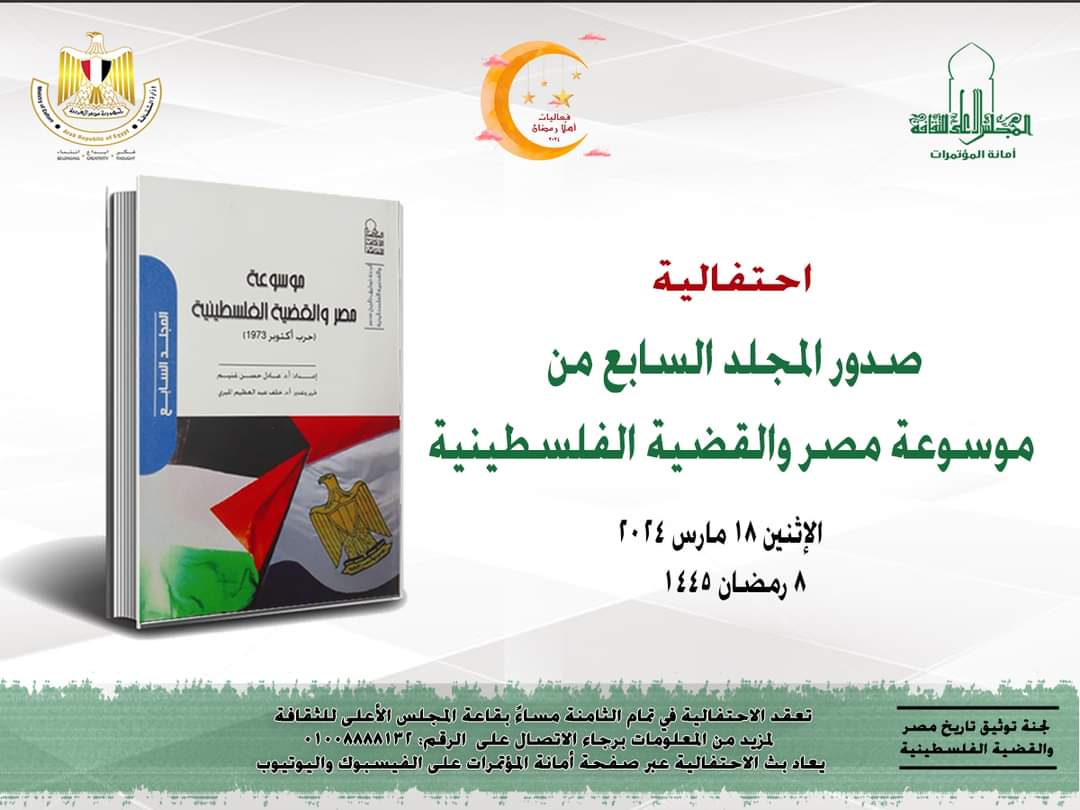 متابعة القراءةيتشرف الدكتور هشام عزمي الأمين العام للمجلس الأعلى للثقافة ؛ بدعوة حضراتكم لحضور ومتابعة احتفالية: صدور المجلد السابع من موسوعة مصر والقضية الفلسطينية ؛ والتي ينظمها المجلس الأعلى للثقافة ؛ وذلك غدا .. في تمام الثامنة مساء يوم الأثنين الموافق ١٨ مارس ٢٠٢٤. يدير الاحتفالية ويشارك بها : الدكتور خلف