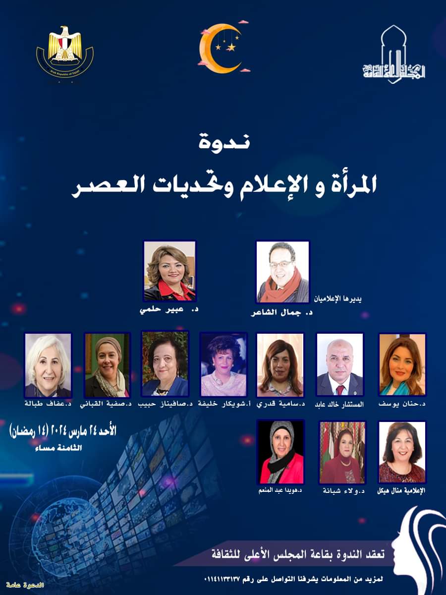 متابعة القراءةتحت رعاية الدكتورة نيفين الكيلاني - وزيرة الثقافة؛ يتشرف الدكتور هشام عزمي - الأمين العام للمجلس الأعلى للثقافة؛ والدكتورة مني الحديدي - مقررة لجنة الشباب، والدكتور جمال الشاعر – مقرر لجنة الإعلام بدعوة حضراتكم لحضور ومتابعة ندوة بعنوان "المرأة والإعلام وتحديات العصر" في إطار الاحتفال باليوم العالمي للمرأة، والتى تنظمها