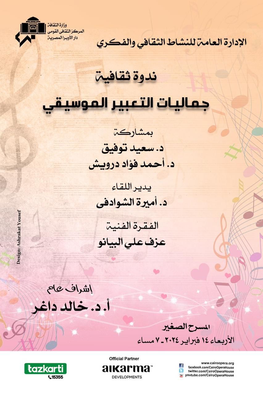 متابعة القراءةتتواصل فعاليات الثقافة المصرية الهادفة الى تطوير وعى المجتمع والارتقاء بالوجدان حيث تعقد دار الاوبرا برئاسة الدكتور خالد داغر ضمن نشاطها الثقافى والفكرى ندوة بعنوان جماليات التعبير الموسيقي يشارك فيها الدكتور سعيد توفيق ، الدكتور أحمد فؤاد درويش وتديرها الدكتورة أميرة الشوادفي ويتخللها فقرة للعزف على الة البيانو وذلك فى