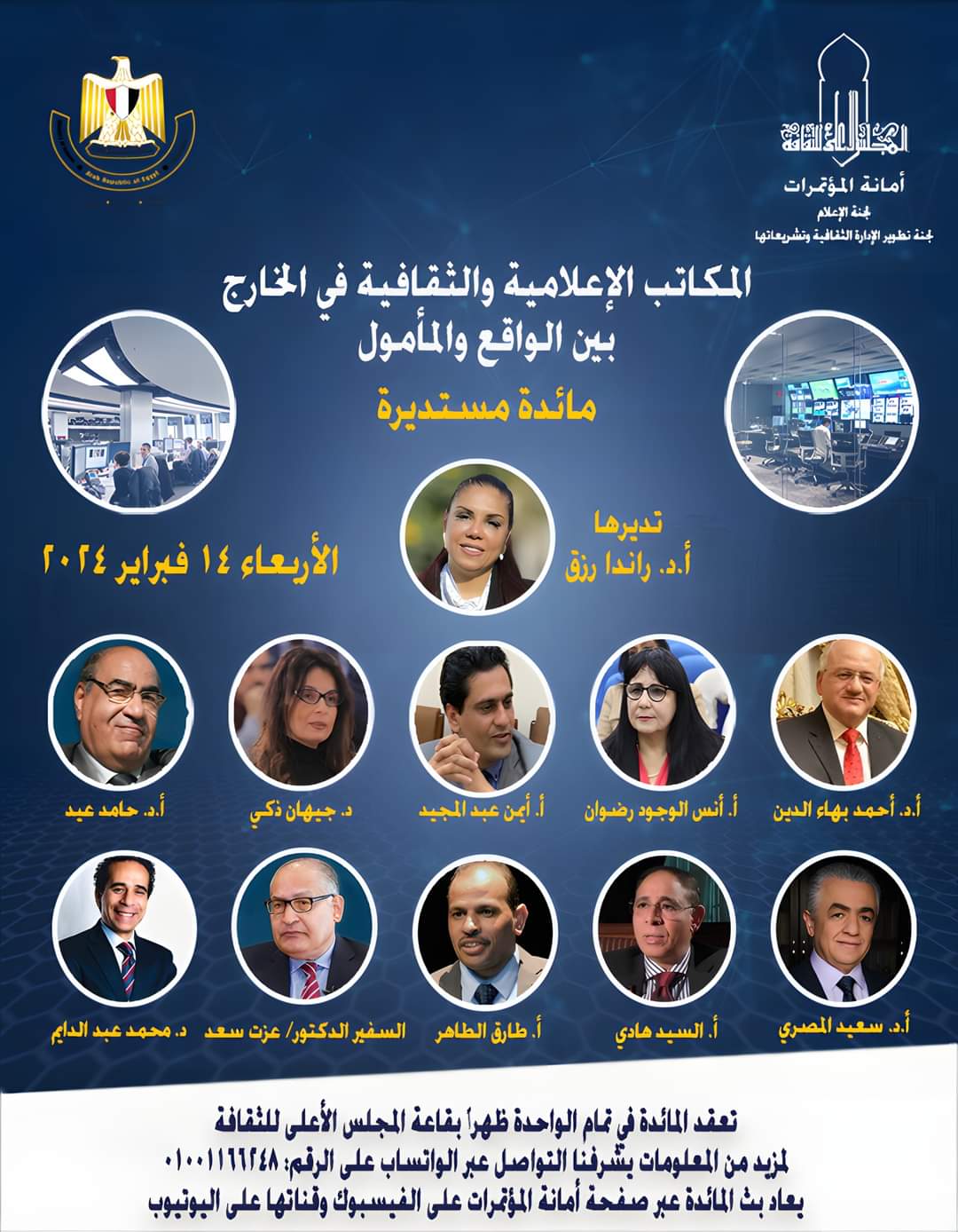 متابعة القراءةتعقد الإدارة الثقافية وتشريعاتها، ومقررها الدكتور سعيد المصري، مائدة مستديرة بعنوان: "المكاتب الإعلامية والثقافية فى الخارج بين الواقع والمأمول"، وذلك في تمام الواحدة ظهر غدا الأربعاء الموافق 14 فبراير ٢٠٢٤؛ بقاعة المجلس الأعلى للثقافة.برعاية الدكتورة نيفين الكيلاني وزيرة الثقافة، وبإشراف الدكتور الإعلام ومقررها الدكتور/ جمال الشاعر بالتعاون مع لجنة تطوير