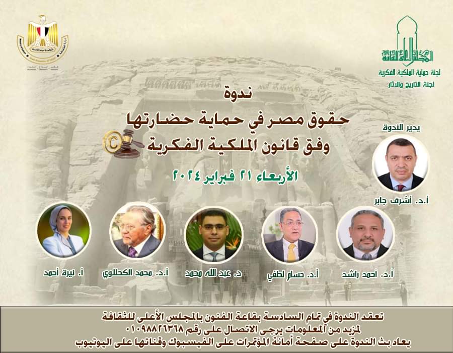 متابعة القراءةتنظم لجنة حماية الملكية الفكرية ومقررها الدكتور أشرف جابر بالتعاون مع لجنة التاريخ والآثار، ومقررها الدكتور محمد السيد عبد الغني ندوة بعنوان: "حقوق مصر في حماية حضارتها وفق قانون الملكية الفكرية"، وذلك في تمام السادسة مساء الأربعاء الموافق ٢١ فبراير ٢٠٢٤؛ بقاعة الفنون. وذلك تحت رعاية الدكتورة نيفين الكيلاني وزيرة