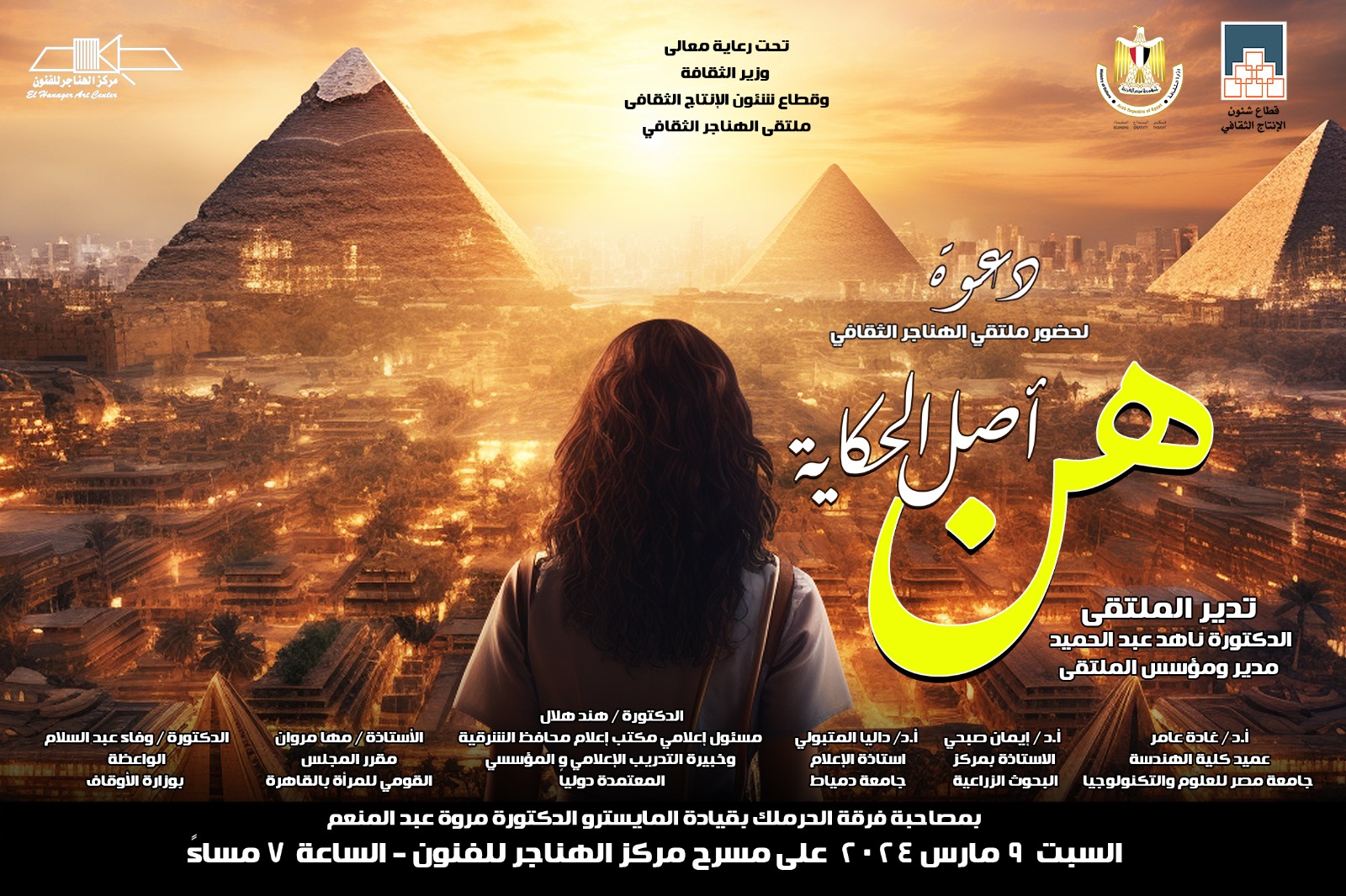 يقيم قطاع شئون الإنتاج الثقافى برئاسة المخرج خالد جلال احتفالا بشهر المرأة المصرية والعالمية ملتقى الهناجر الثقافي الشهرى، تحت عنوان "هن أصل الحكاية" فى السابعة من مساء غد السبت، بمركز الهناجر للفنون برئاسة الفنان شادى سرور. يتحدث فى الملتقى الأستاذة الدكتورة غادة عامر عميد كلية الهندسة جامعة مصر للعلوم والتكنولوجيا،