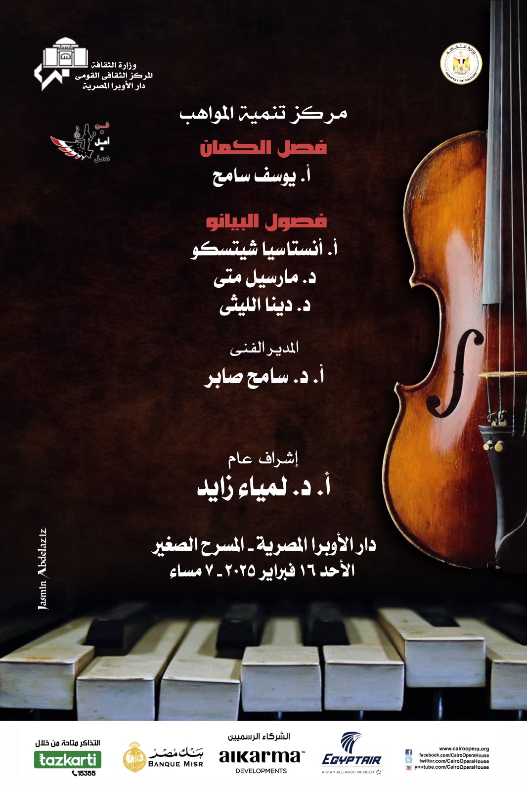 تنظم دار الأوبرا المصرية برئاسة الدكتورة لمياء زايد حفلاً للدارسين بمركز تنمية المواهب تحت إشراف مديره الفنى الدكتور سامح صابر فصل الكمان وفصول البيانو فى السابعة مساء الأحد ١٦ فبراير على المسرح الصغير . وذلك إستمراراً لجهود وزارة الثقافة الداعمة للمواهب الفنية الواعدة وخلاله يقدم فصل الكمان تدريب