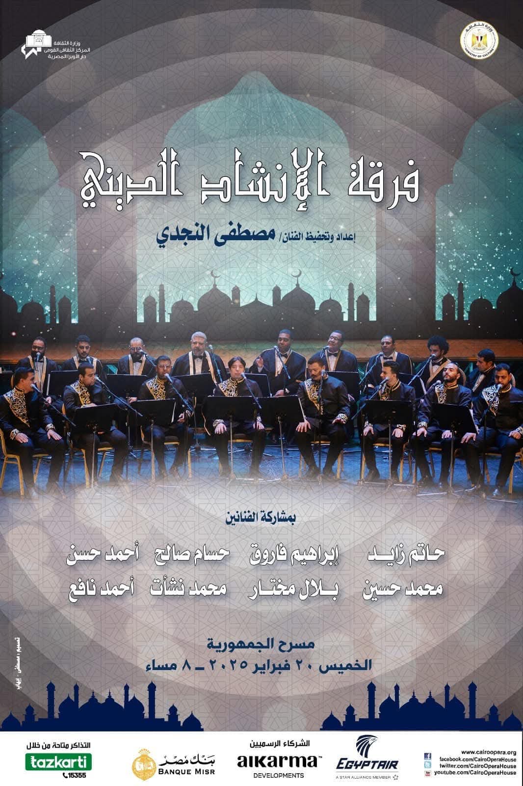 متابعة القراءةتنظم دار الأوبرا المصرية برئاسة الدكتورة لمياء زايد حفلاً لفرقة الإنشاد الدينى وذلك فى الثامنة مساء الخميس ٢٠ فبراير على مسرح الجمهورية . يتضمن البرنامج مجموعة مختارة من المؤلفات الروحانية منها توشيح يا بشير الرحمة وأمدح المكمل ، خليك مع الله ، صلى الله على محمد ، على باب سيدنا النبى ،