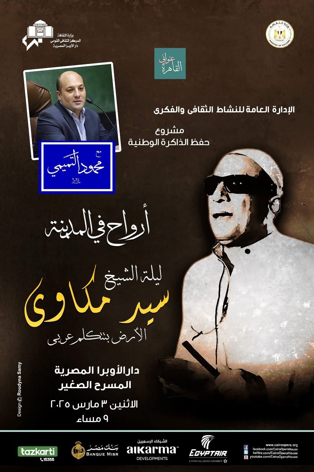 القاهرة عنواني يستعرض مسيرة الشيخ سيد مكاوى على المسرح الصغير تستضيف دار الأوبرا المصرية ضمن نشاطها الثقافى والفكرى لقاء من سلسلة أرواح فى المدينة وذلك إستمراراً للمشروع الثقافى (القاهرة عنوانى) تقديم الكاتب الصحفى محمود التميمى ويأتى بعنوان "ليلة الشيخ سيد مكاوى .. الأرض بتتكلم عربى "ويستضيف إبنته أميرة