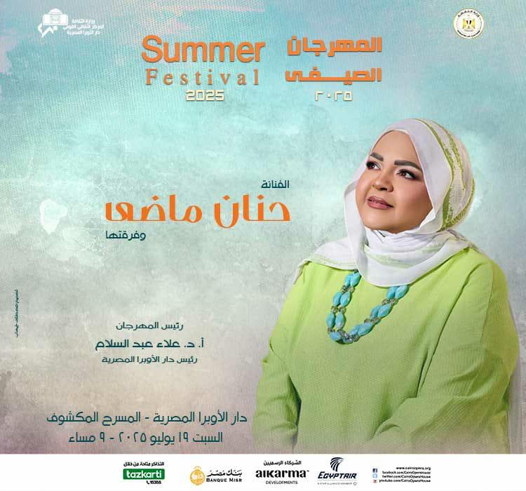 تواصل وزارة الثقافة ممثلة فى دار الأوبرا المصرية برئاسة الدكتور علاء عبد السلام فعاليات برنامج المهرجان الصيفى على المسرح المكشوف حيث تلتقي الفنانة حنان ماضي بجمهورها فى ثانى ليلة وذلك فى التاسعة مساء السبت 19 يوليو . يتضمن البرنامج نخبة من أعمالها الغنائية الشهيرة بالإضافة إلى تترات المسلسلات الدرامية